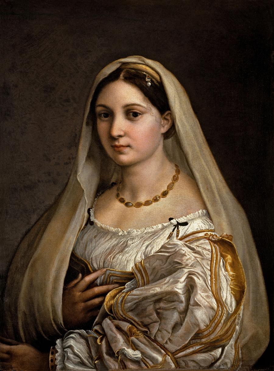 拉斐尔如此含情脉脉地再现这个肖像的美,据说画上的披纱女郎是拉斐尔的情人芙纳蕾娜。从美丽肤色到华贵服饰上的绵密衣褶都被细致入微地描绘出来。以及按在胸前的那只右手,都被刻画得十分细腻。